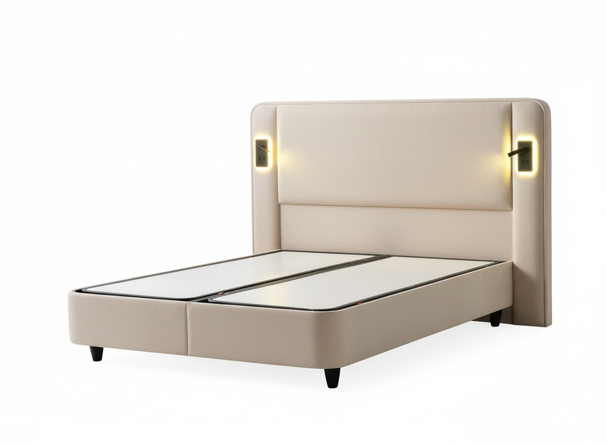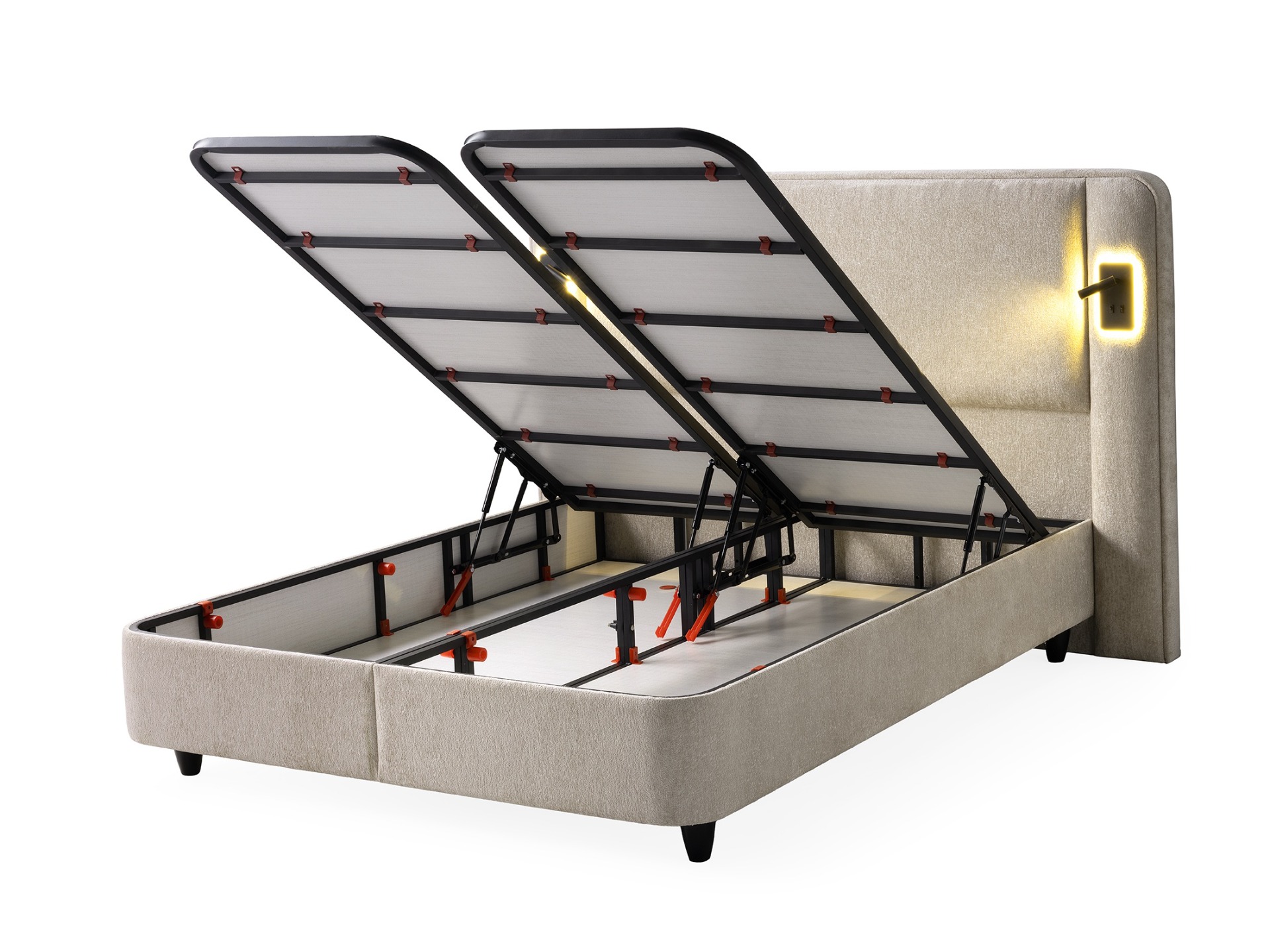 Boxspring Lorenzo opbergbed lichte beigekleur met verlichting.