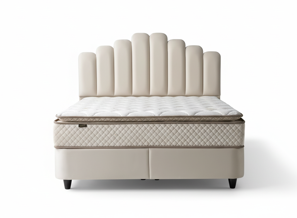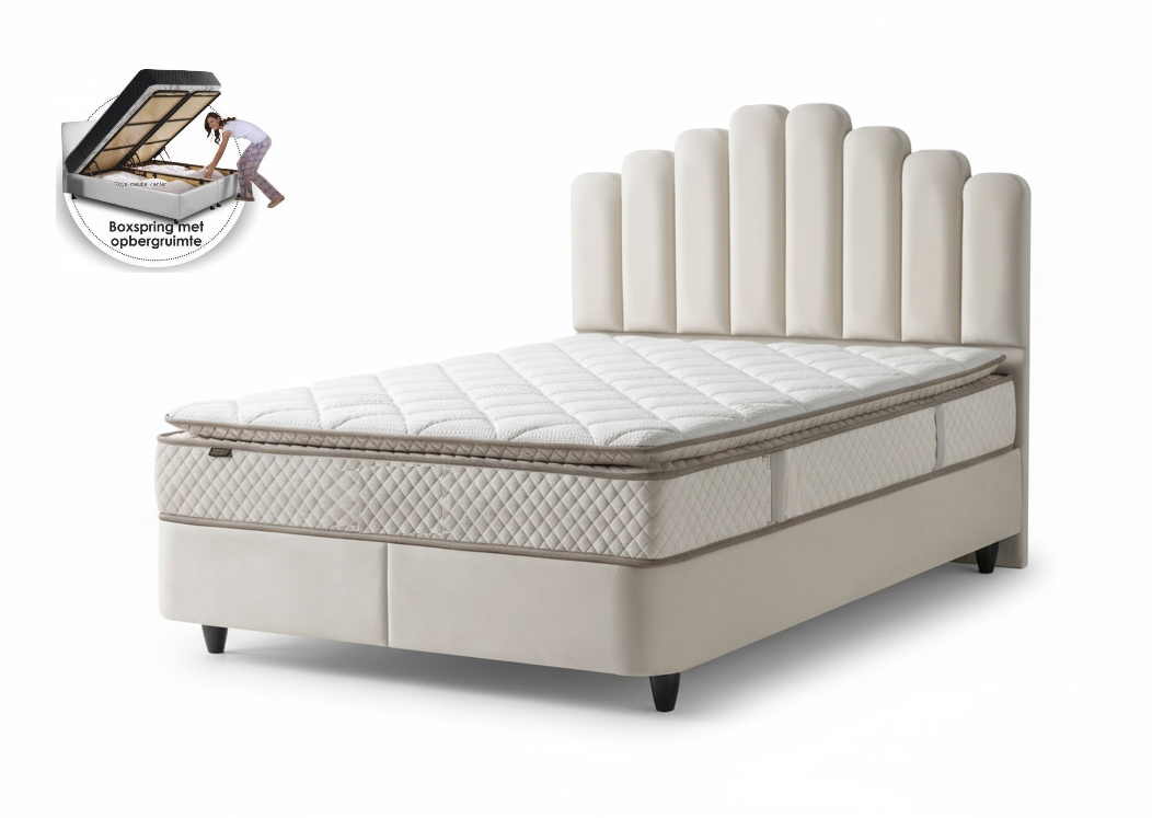 Boxspring Jazz opbergbed set luxe Velvet stof Licht Crème kleur.